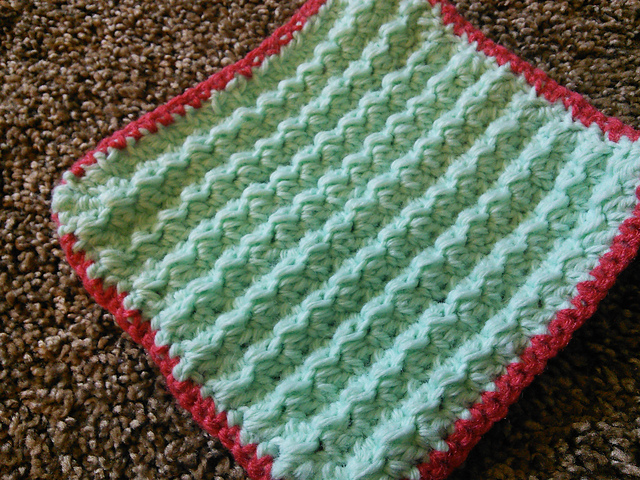 This dishcloth uses the Gentle Ridges pattern, with the body in light teal and the border in persimmon. I'm plowing through the yarns, so I'm trying to keep the color ratio pretty even. This was another crochet pattern.