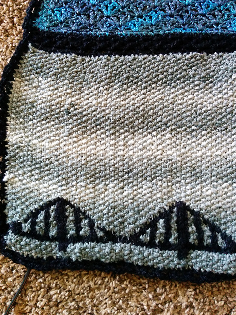It's been long enough, though, that we can distinguish this area and this part of our lives, and therefore add a block to our blanket (details). The block I chose to make was based off a pattern on Ravelry called San Francisco, which featured a silhouette of the Golden Gate Bridge (which honestly we never go on, we just use the work-horse Bay-Bridge), against a rainbow setting sun.