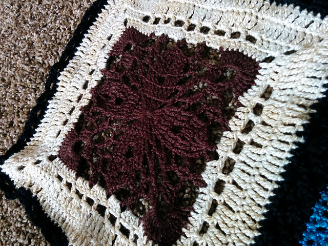 The pattern, Royal Romance, was easy to crochet, and fit well into the general form of the blanket, although this is by far the stretchiest and thinnest block we have. I used a hook size larger than what it asked for, and the block was almost too big!
