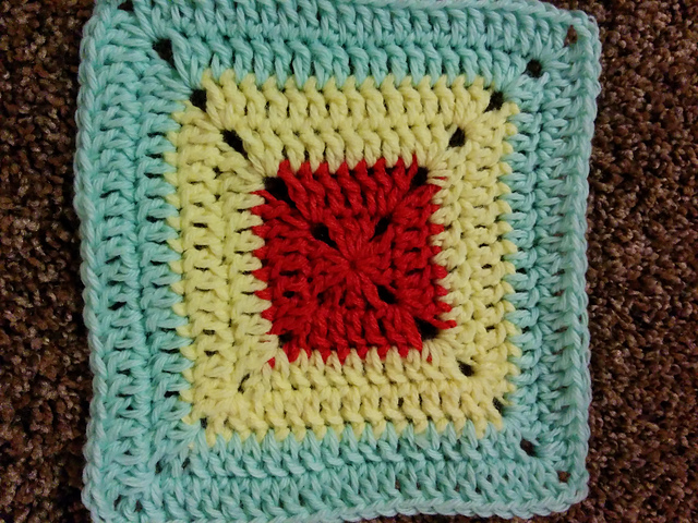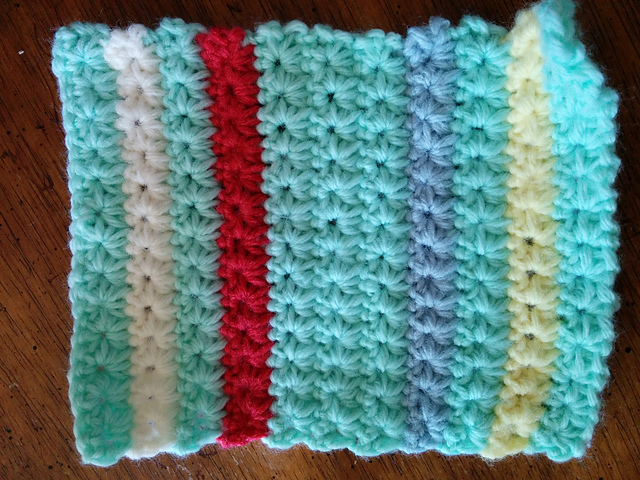 Knit with a crochet border, I actually recently purchased a book of crochet borders (there's that birthday money again!) which I love, and I decided to change the border from the pattern to use one of those. Unfortunately, I realized the border I chose was way to big, so I only got through two rows, and I decided to just leave it.
